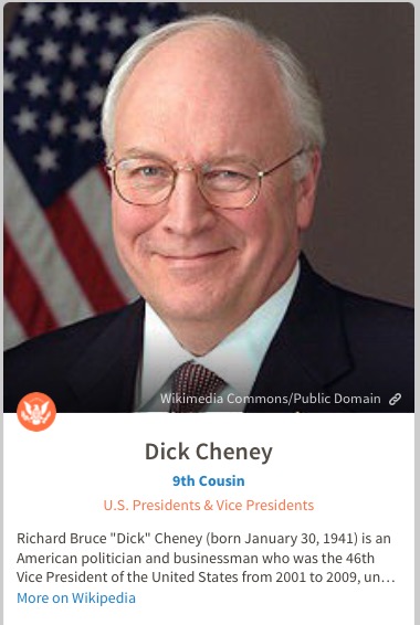 Based on preliminary research, the most promising matches in this new group are Dick Cheney and Josh Brolin, although additional research is needed to confirm both.