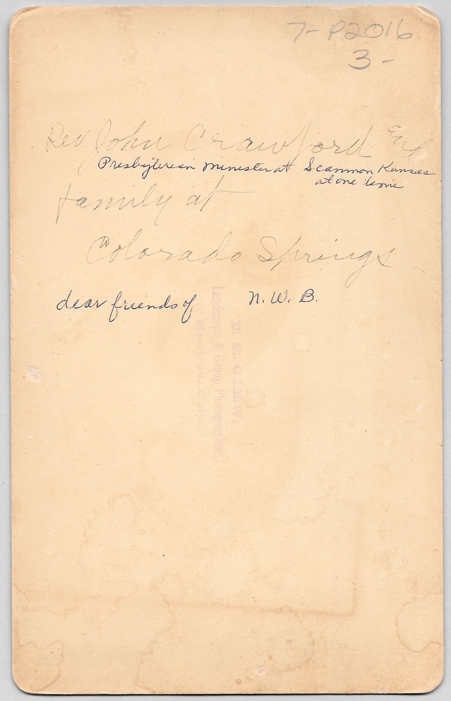 “Rev. John Crawford (Presbyterian Minister at Scammon Kansas at one time) and family at Colorado Springs | dear friends of N.W.B.”