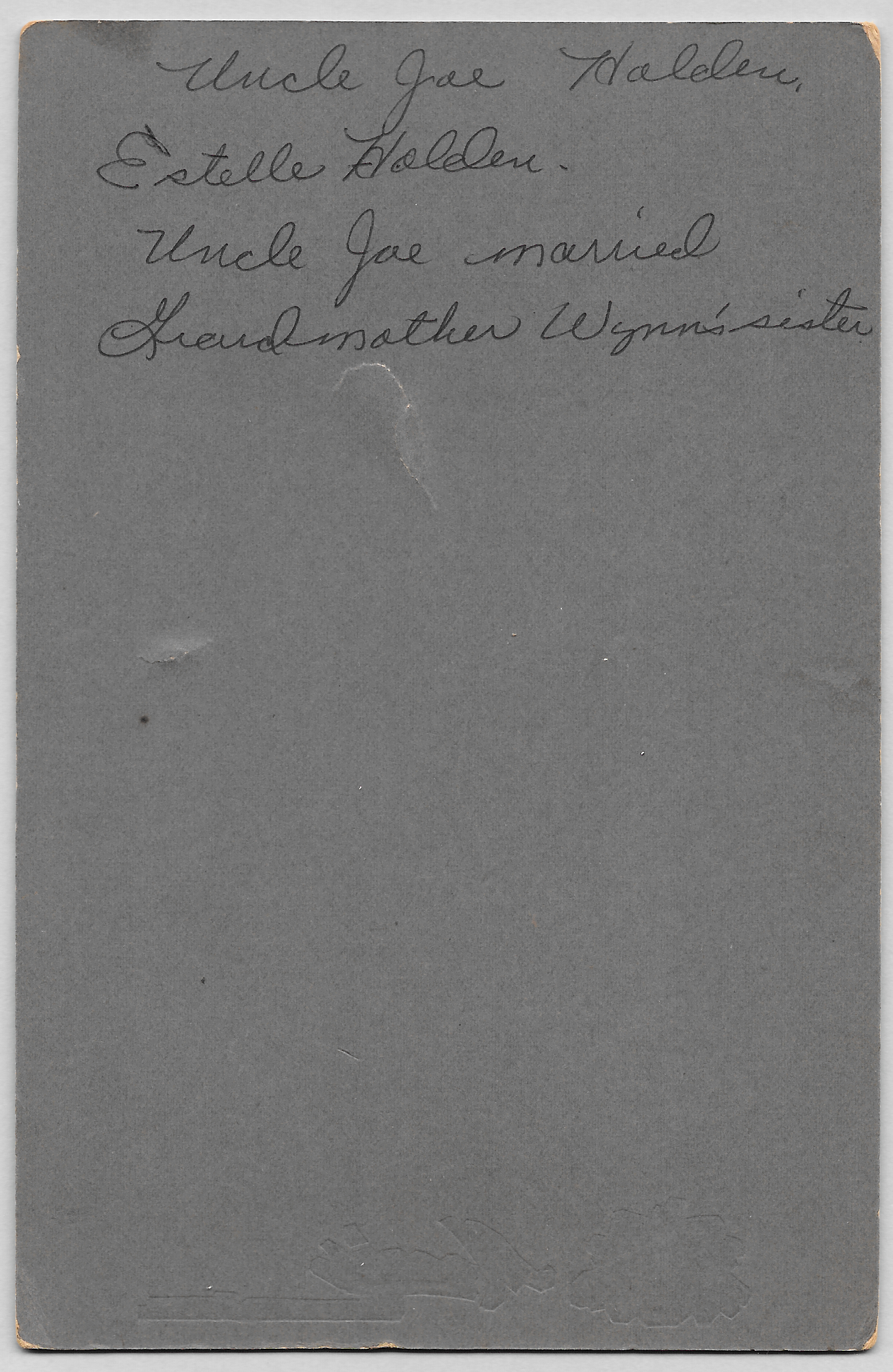 “Uncle Joe Holden, Estelle Holden. Uncle Joe married Grandmother Wynn’s sister”