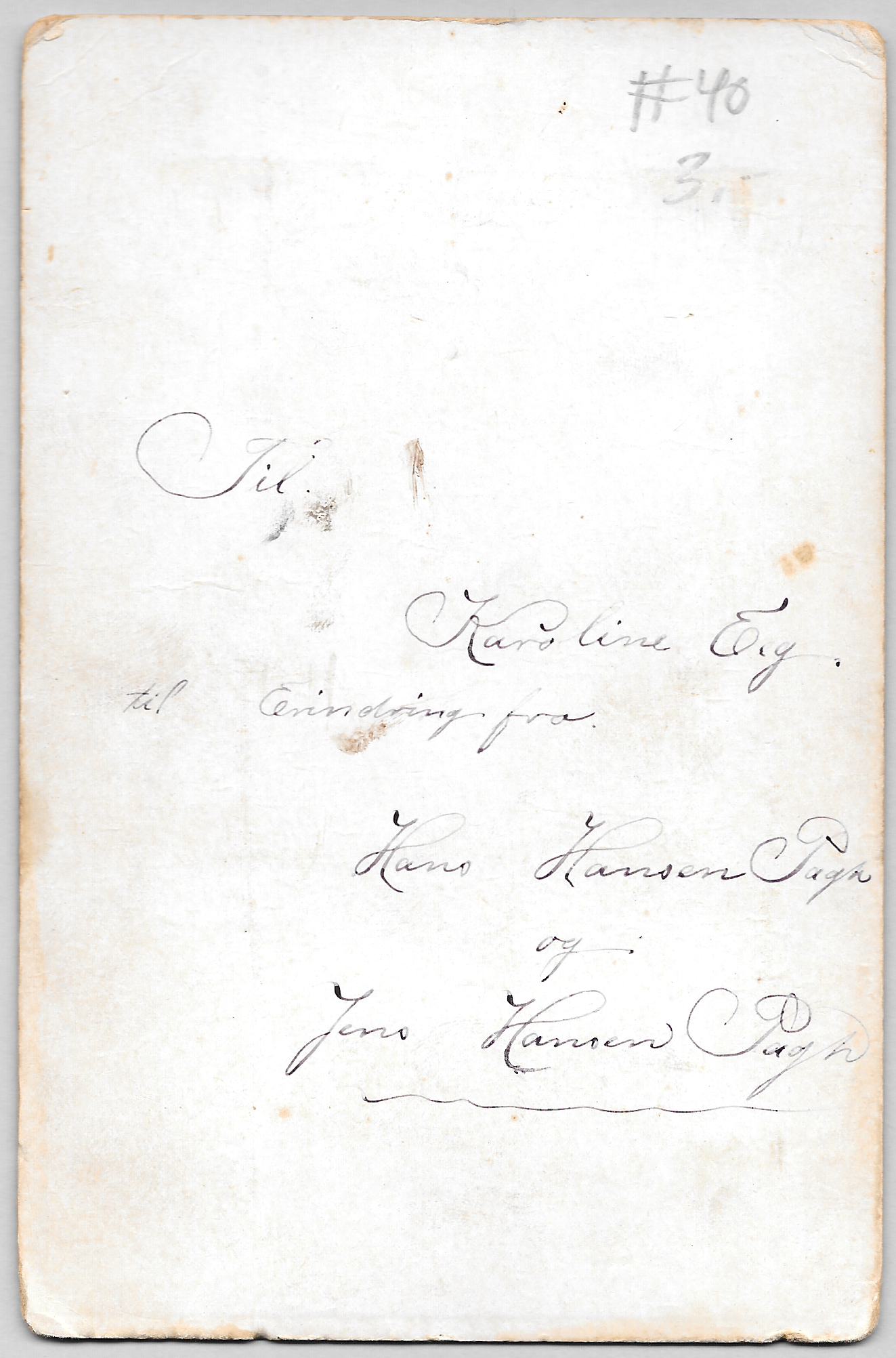 “Til. | Karoline Esq. til Eninding fra. | Hans Hansen Pagh og Jens Hansen Pagh”